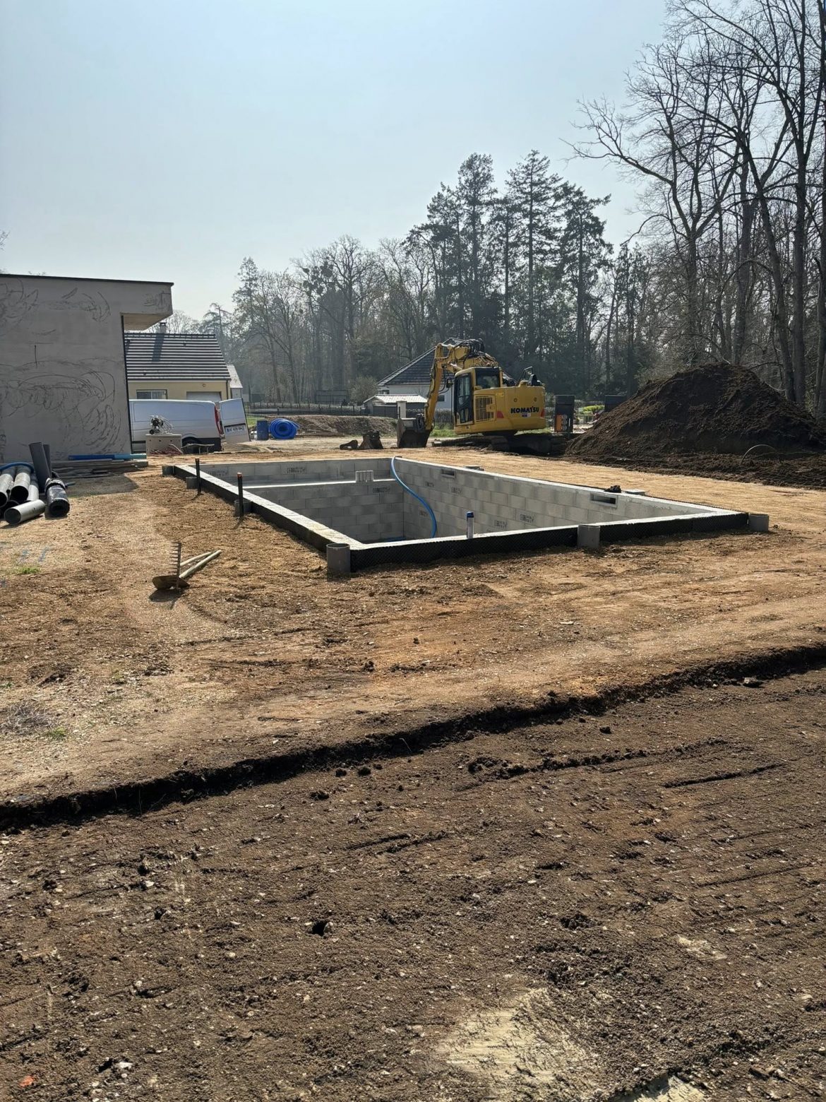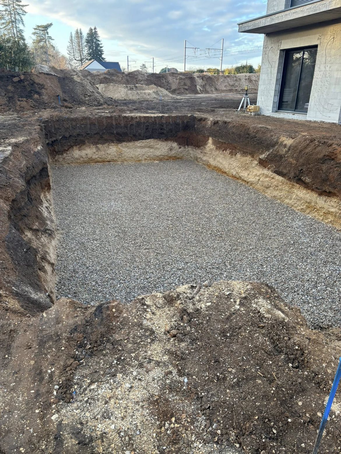 - Terrassement d’une piscine avec puit de décompression et préparation du sol pour les dalles périphériques.